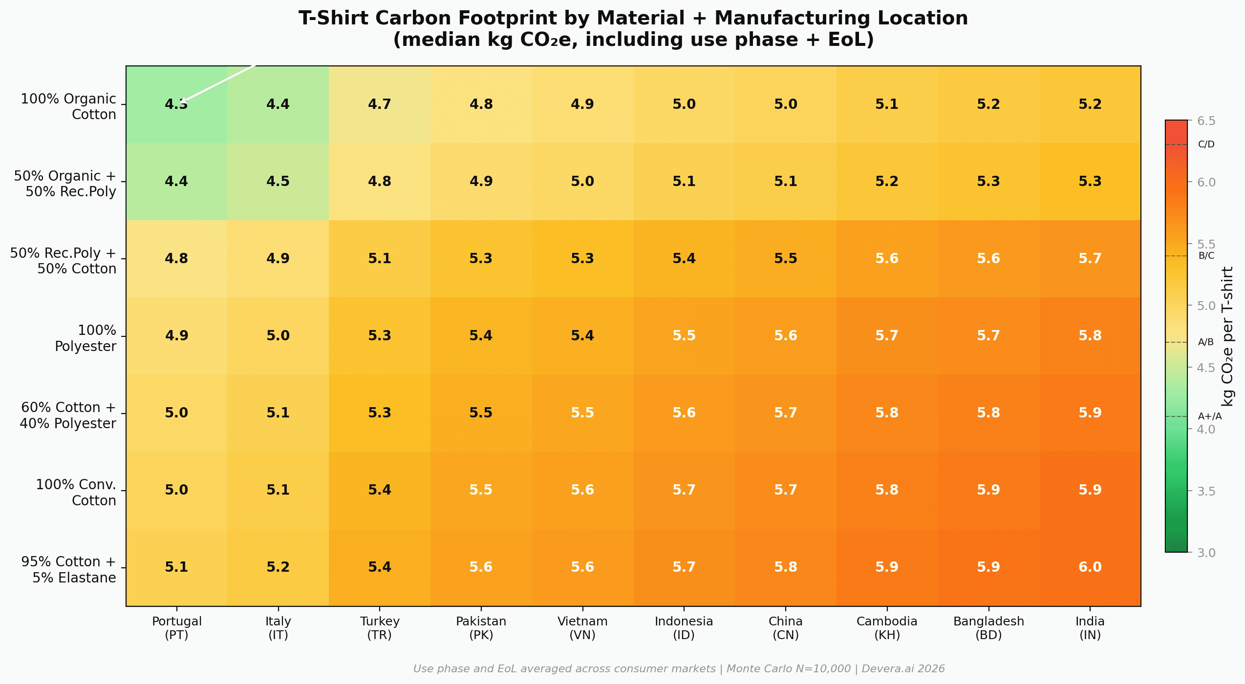 The heatmap reveals two clear patterns. First, material choice creates vertical bands: organic and recycled materials score lower regardless of where they're made. A recycled polyester tee made in Bangladesh still beats a conventional cotton tee made in Portugal. Second, manufacturing location creates horizontal gradients: European locations (Portugal at 0.34, Italy at 0.35 kg/kWh) consistently outperform Asian ones (India at 0.71, Bangladesh at 0.61) due to cleaner grids.