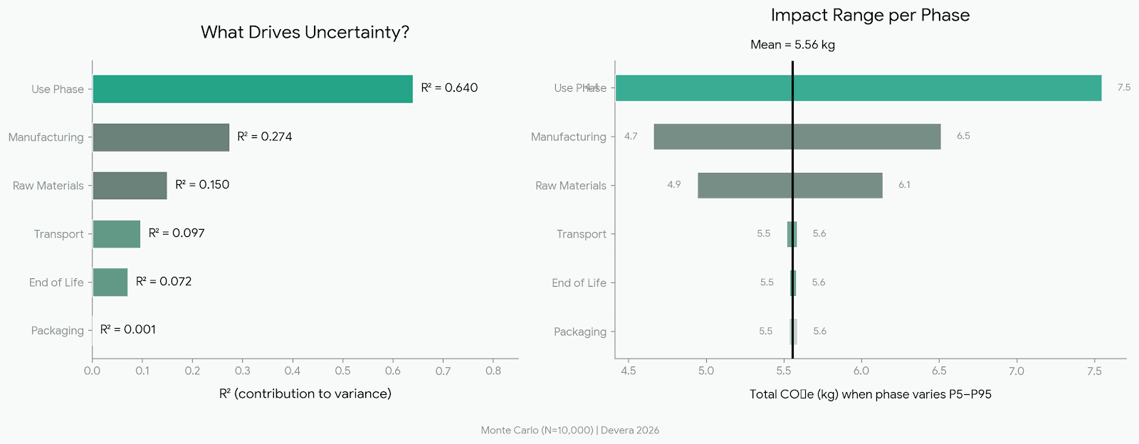 When you simulate 10,000 T-shirts, you can ask a statistical question: which parameter explains the most variation in the total? We measured this using R², the proportion of variance in total CO2e that each phase explains.